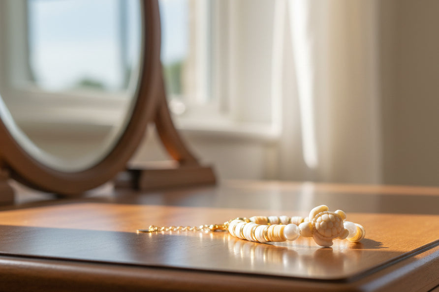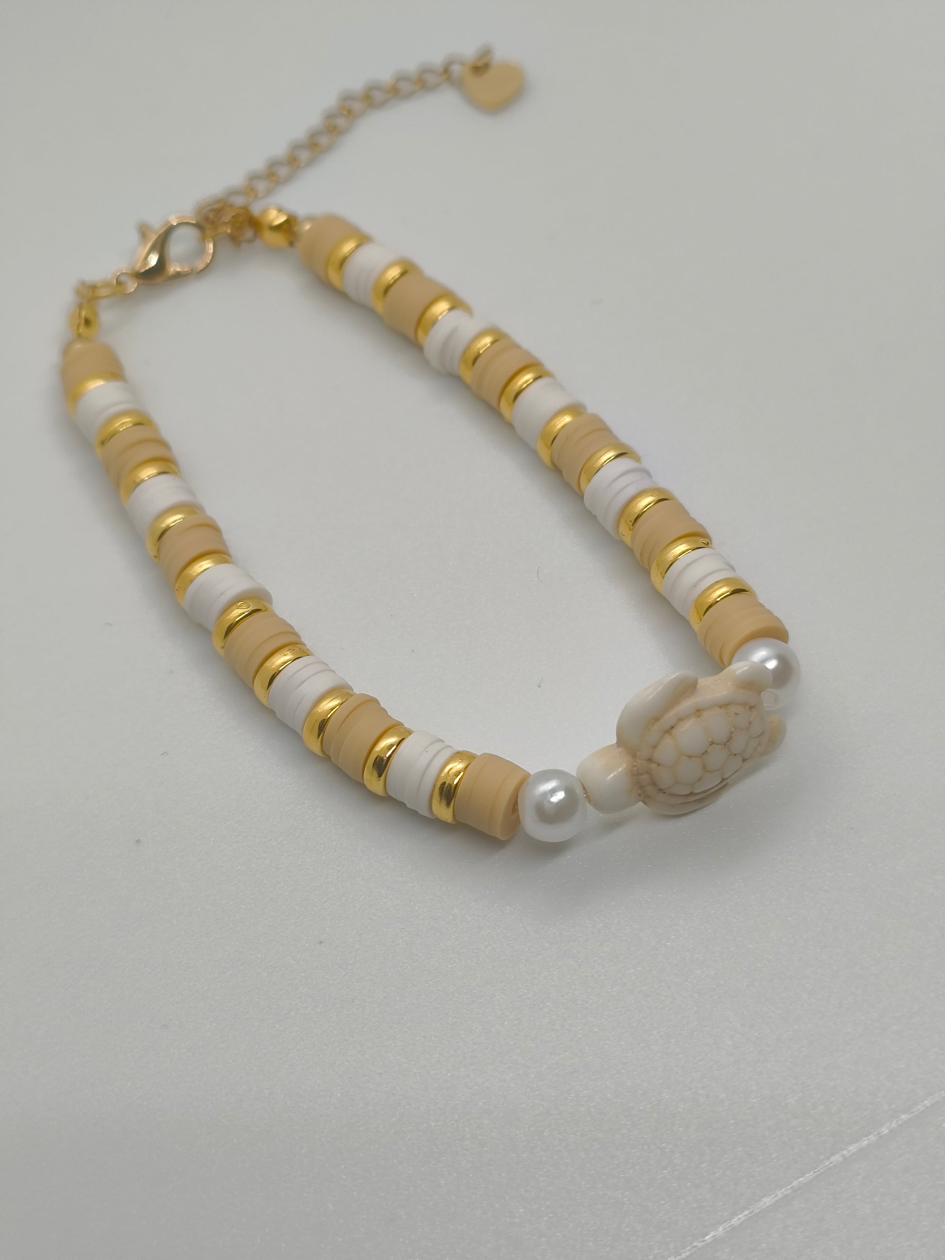 Handcrafted with creamy beige and soft white clay beads, this piece is elevated with polished gold-tone spacers that add a gentle glow. At the centre sits a delicate turtle charm in warm neutral tones, framed by pearl-style beads — symbolising protection, patience, and a steady, grounded spirit.