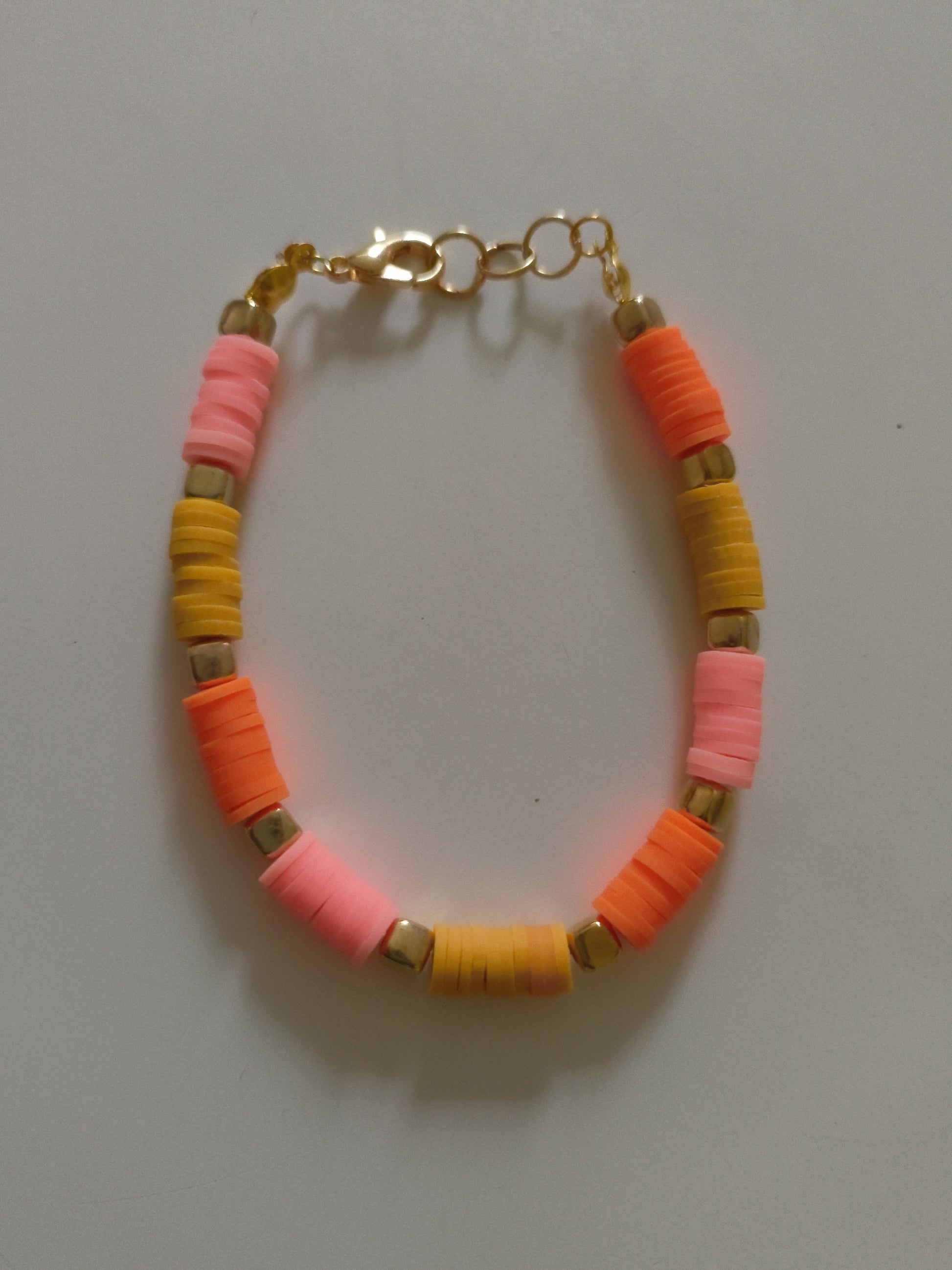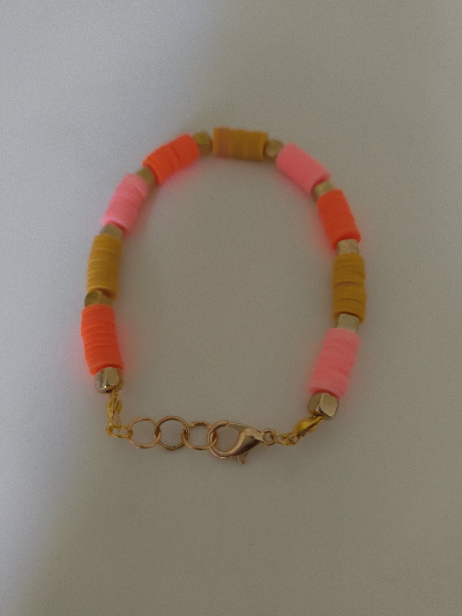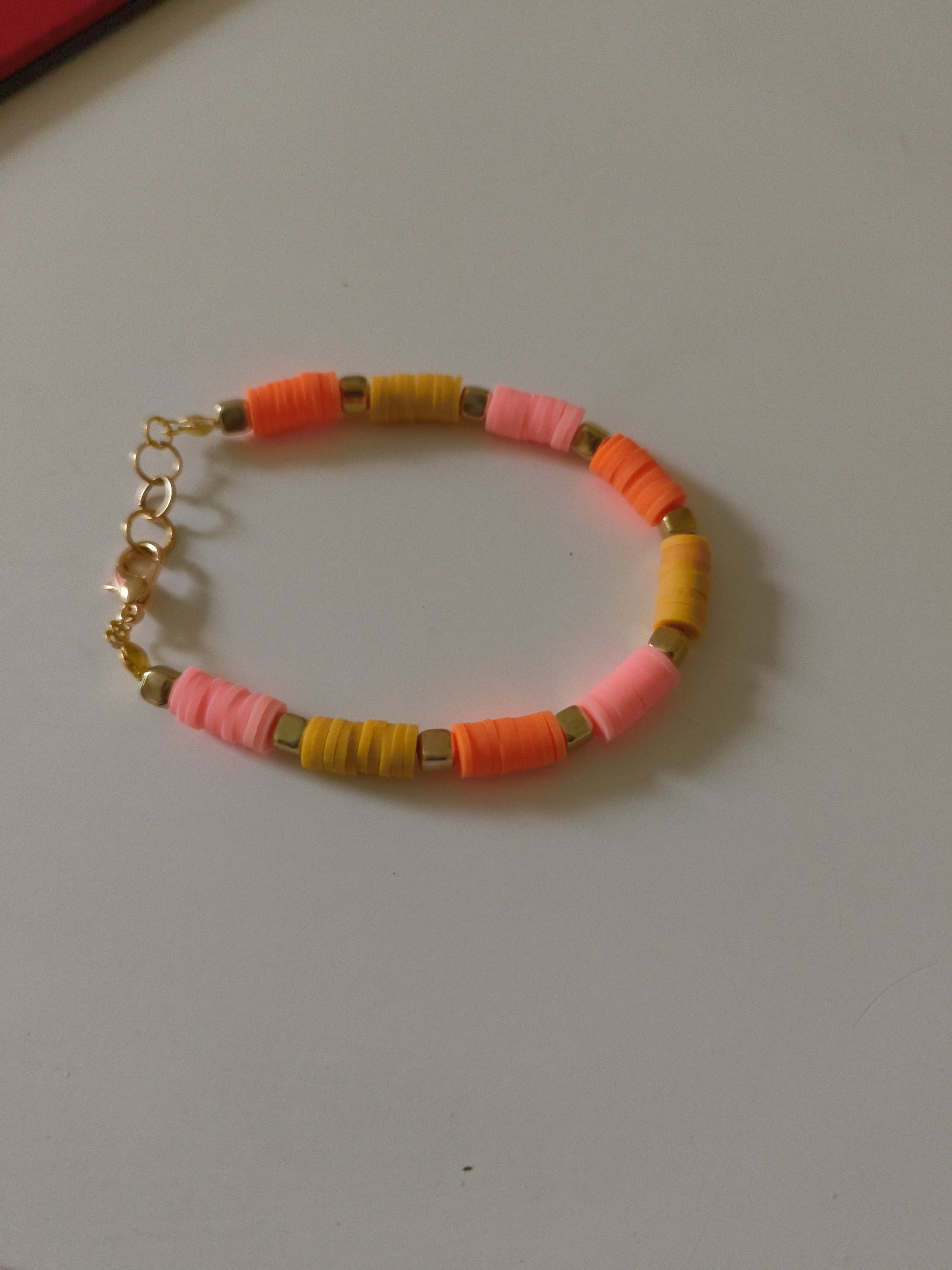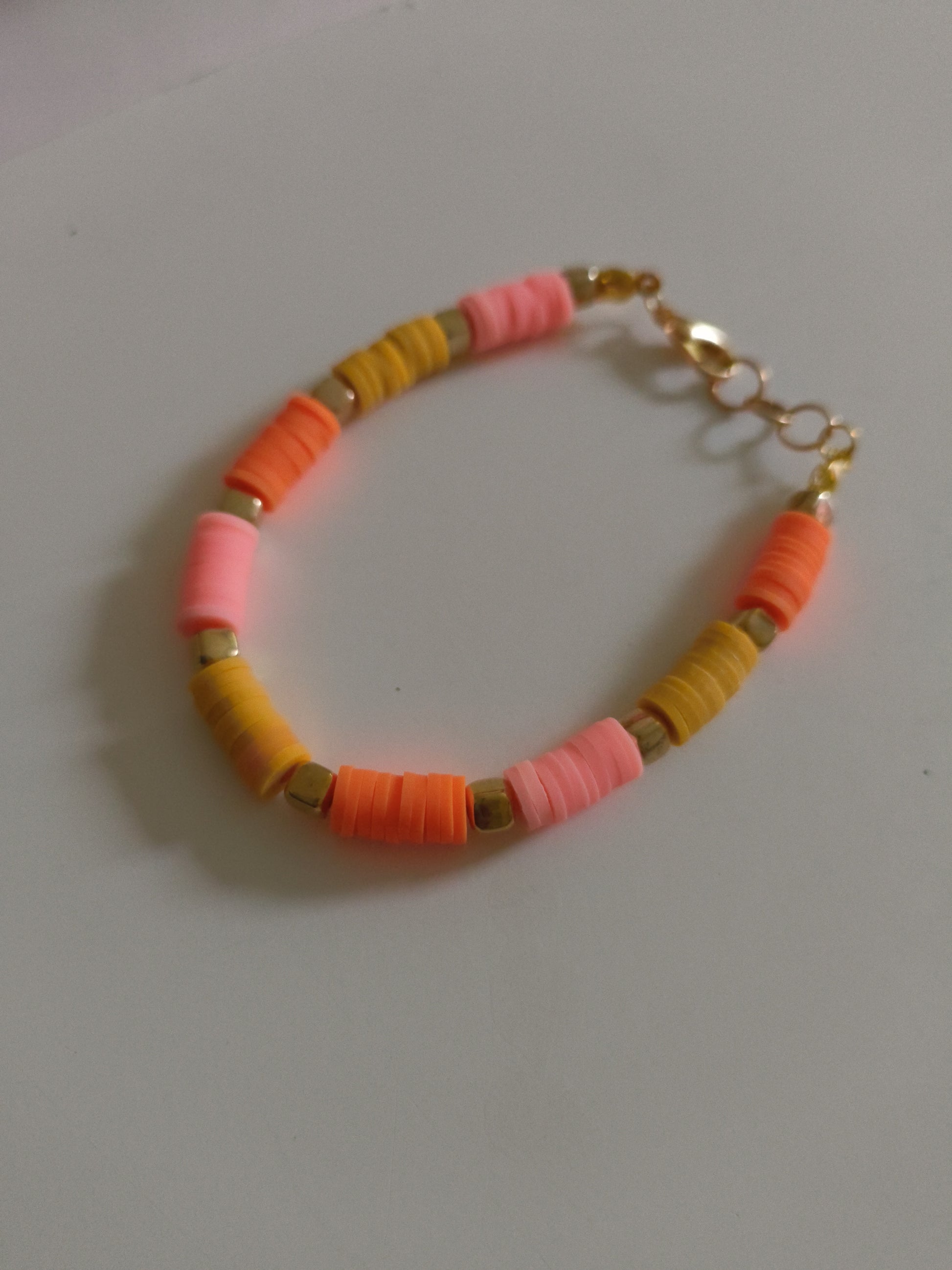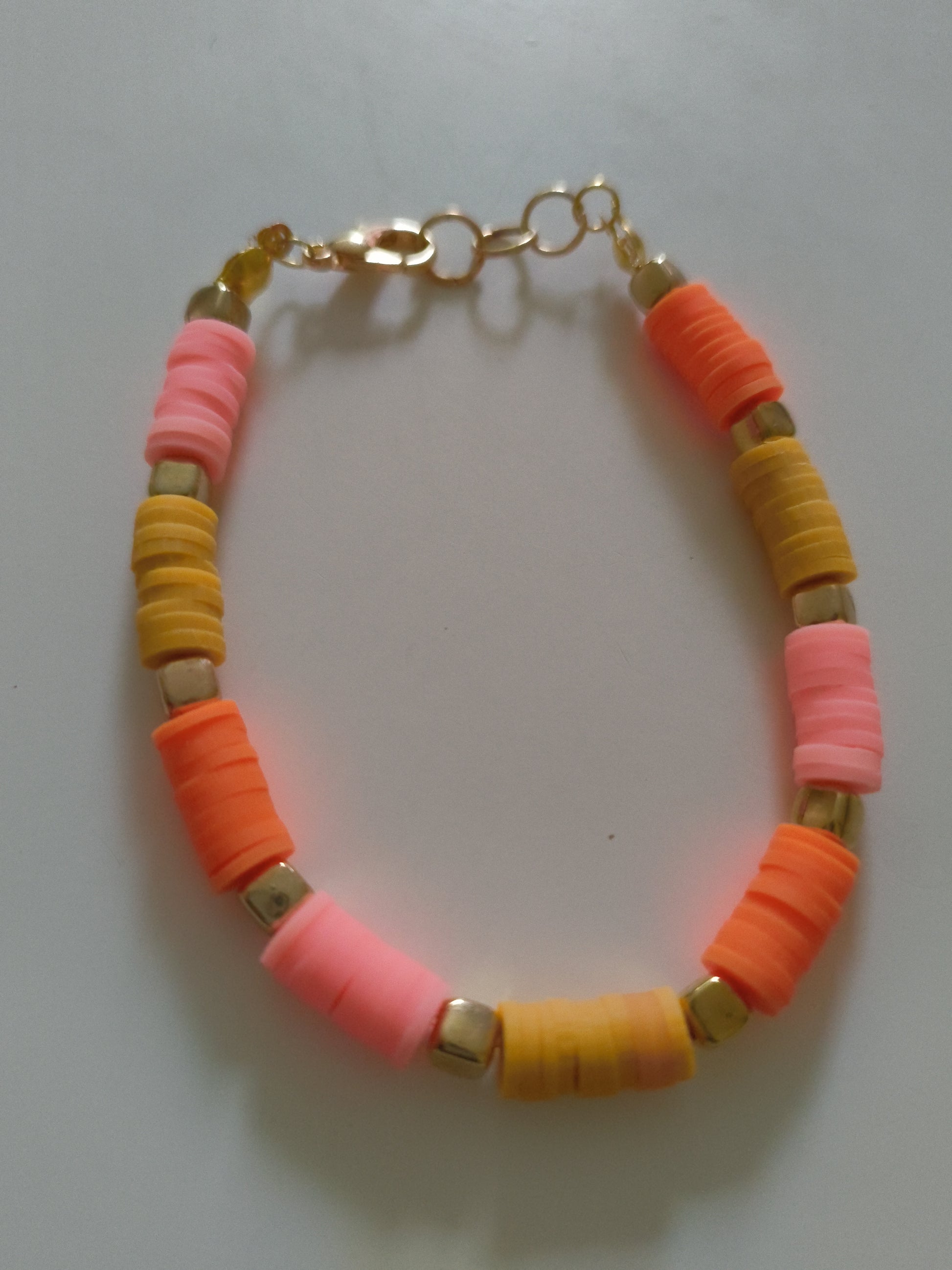 Handcrafted from burnt orange, blush, and mustard yellow polymer clay beads, this bracelet is punctuated with luxe gold-tone cube spacers that catch the light just right. It’s all about those warm, uplifting vibes—perfect solo or layered with your favourites