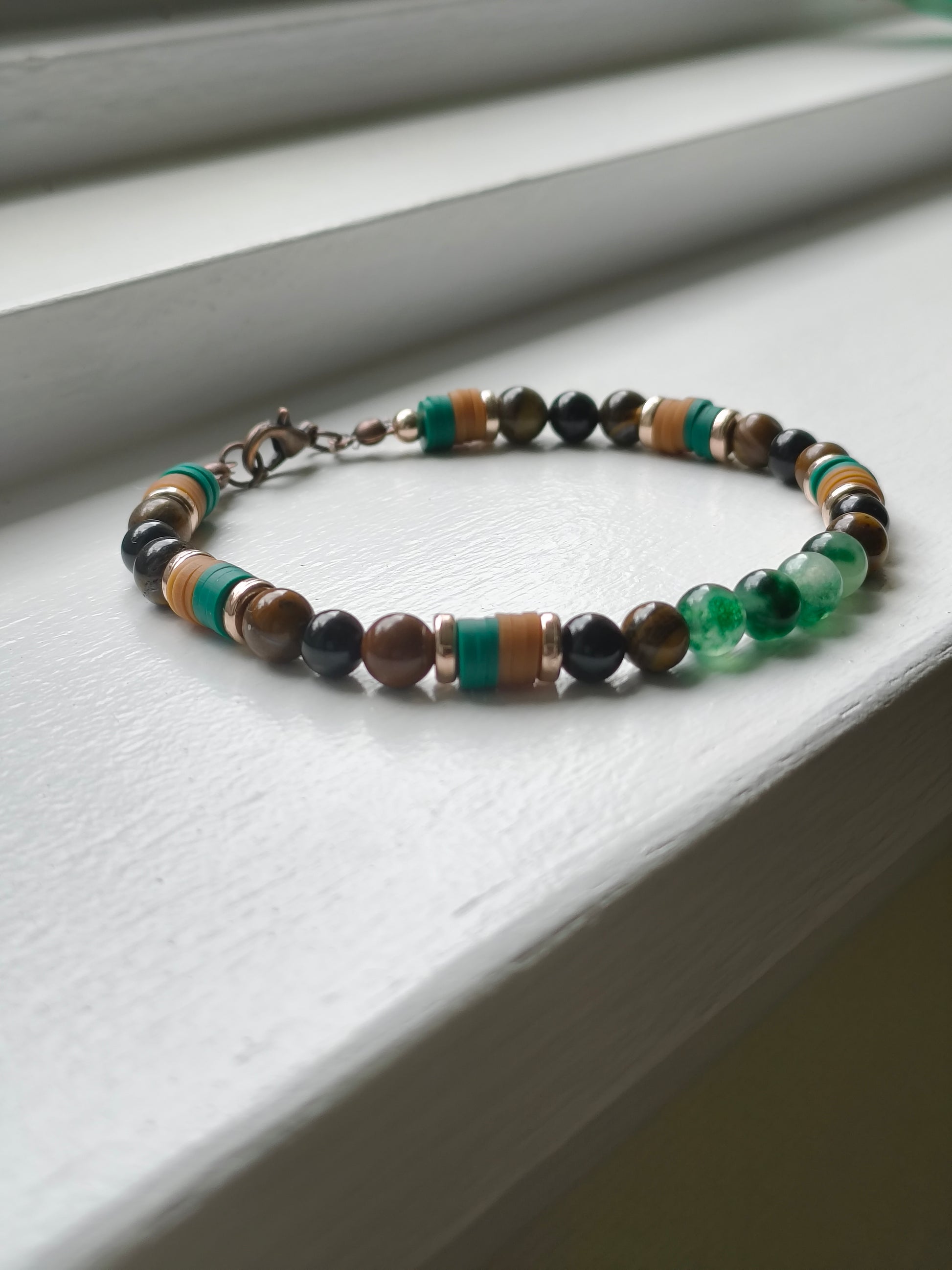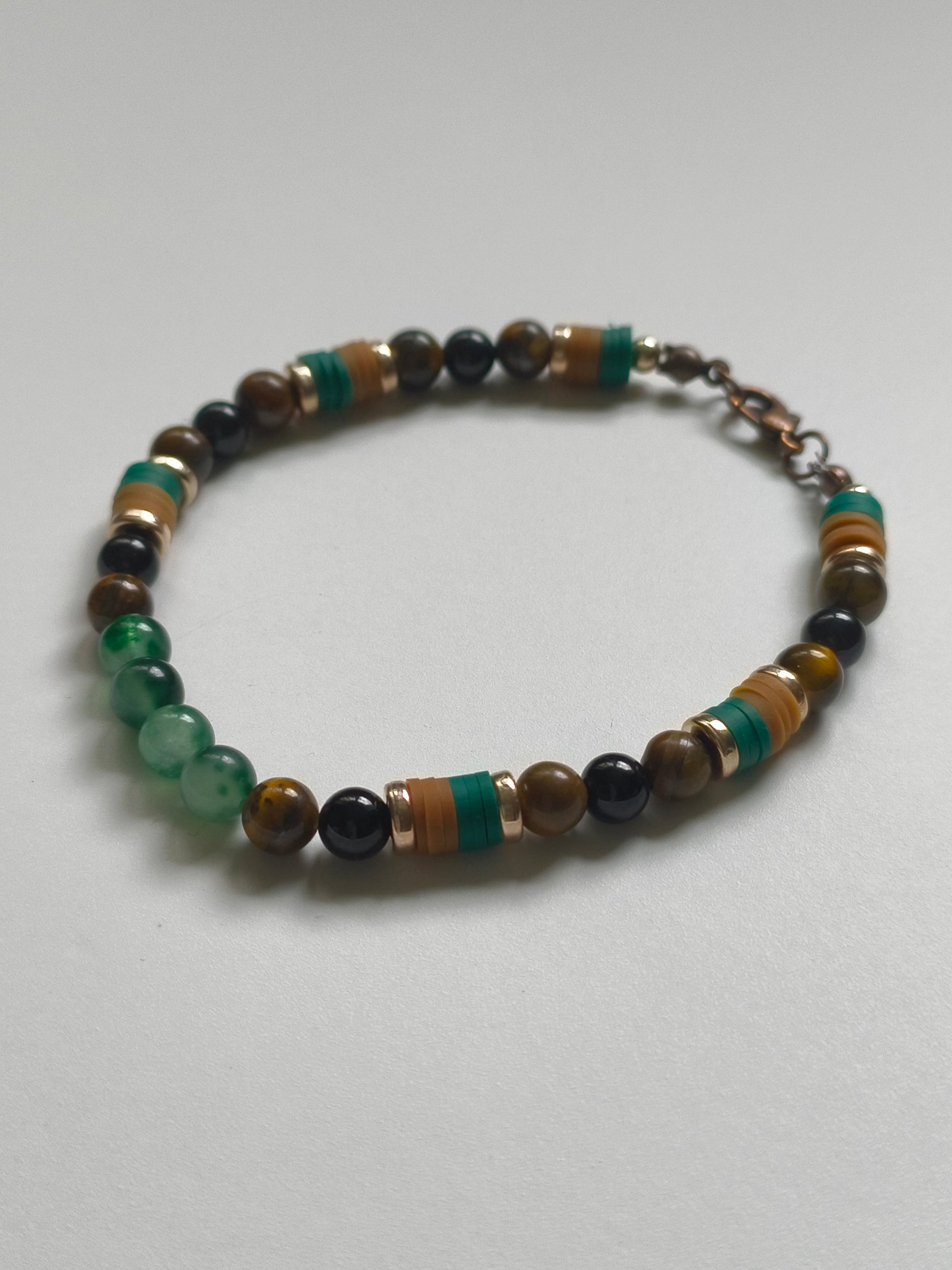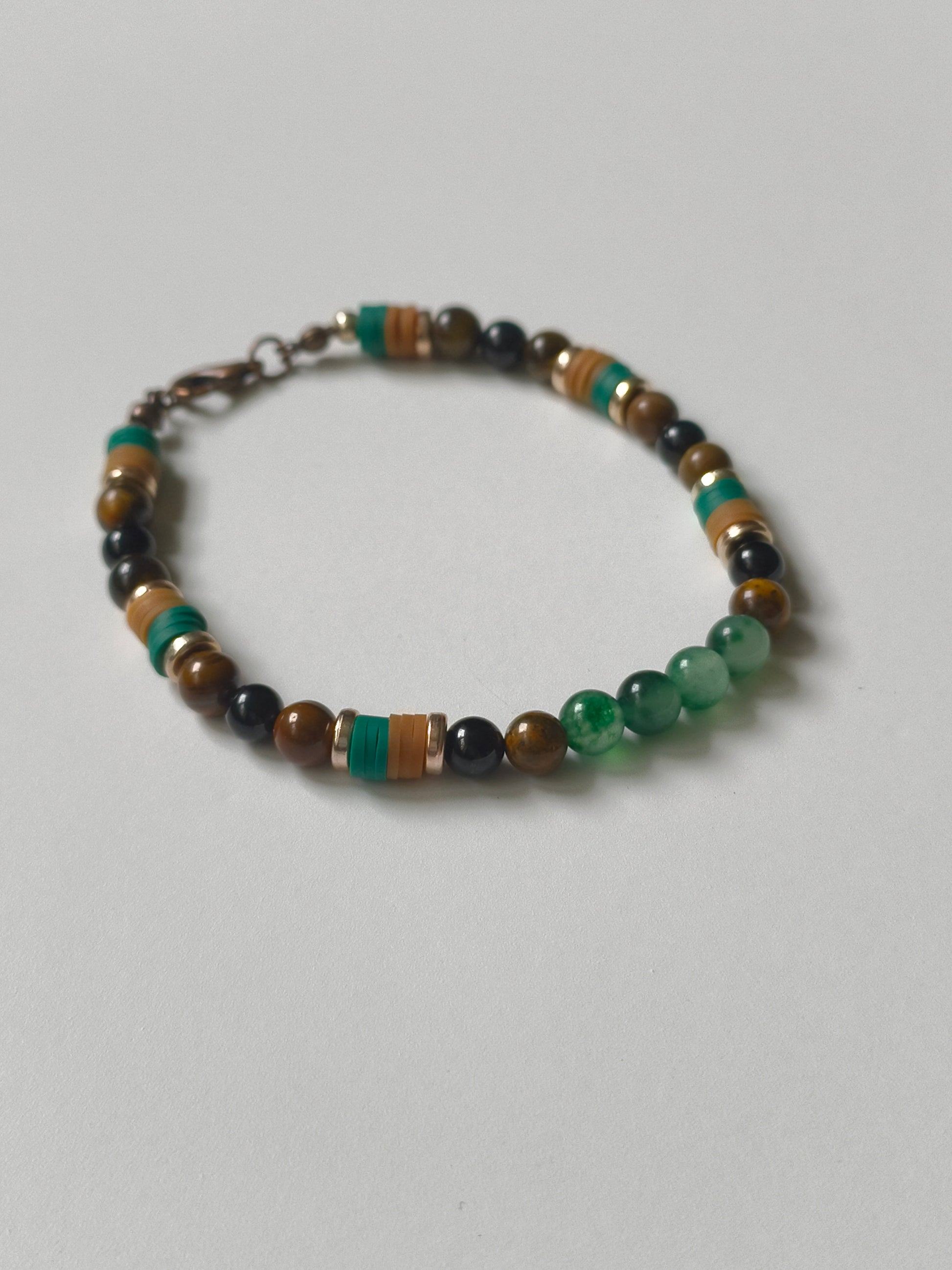 Framed with forest green and rich chocolate brown clay beads and accented with bronze spacers, Jungle Soul feels like walking barefoot through ancient woods. Each bead is intentionally placed to reflect strength, survival, and spiritual depth.