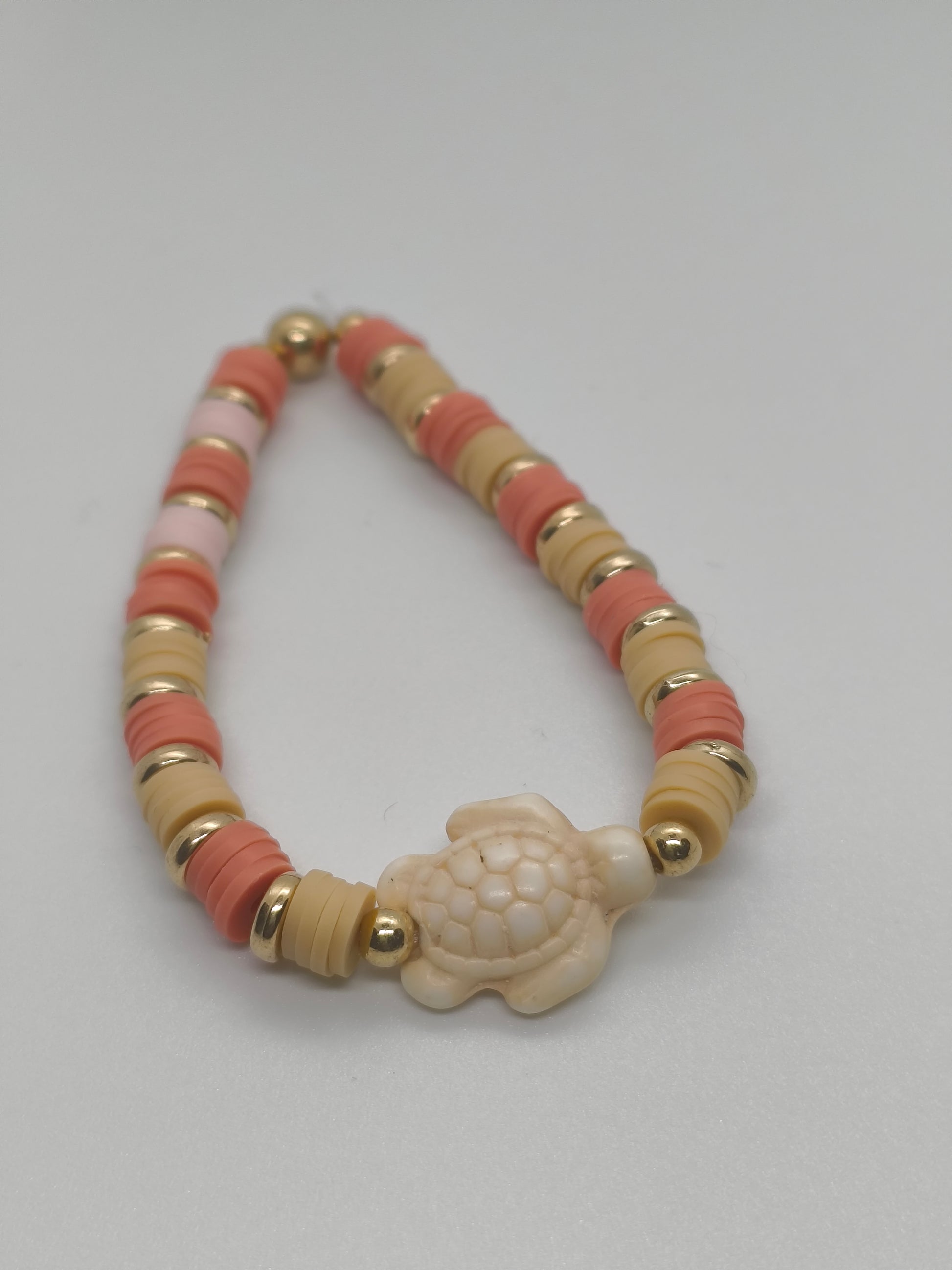 Handcrafted with soft peach, blush, and creamy beige clay beads, this piece is accented with polished gold-tone spacers that add a subtle glow. At the centre sits a neutral turtle charm — a symbol of protection, patience, and steady grounding — bringing balance and meaning to the design.